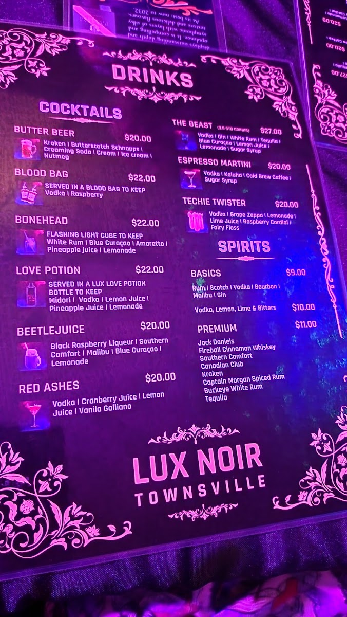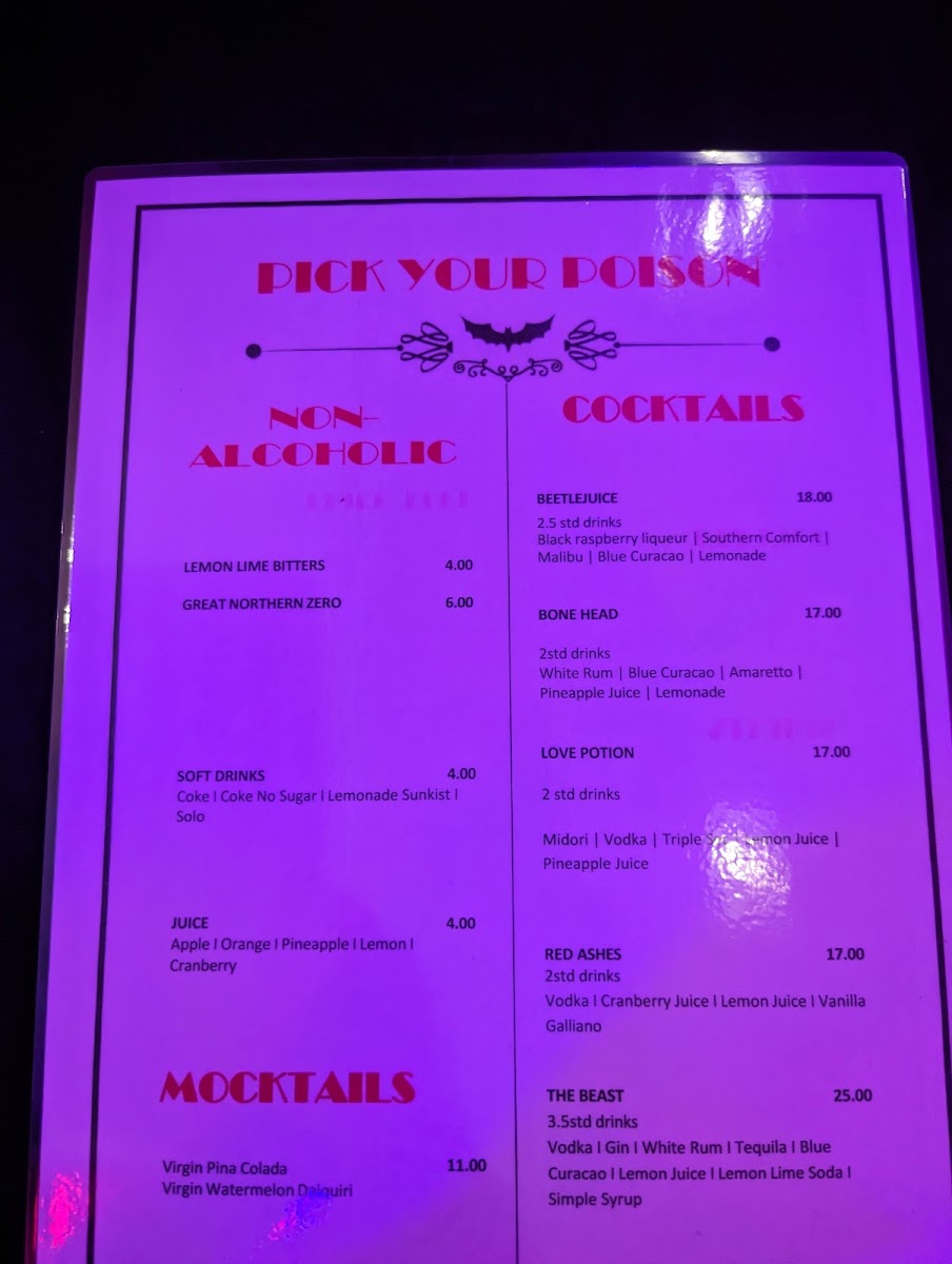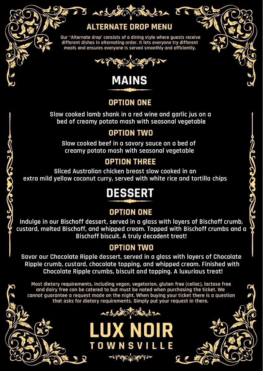 From a reviewer’s perspective, the menu at Lux Noir offers a compact yet intriguing selection that leans into bold presentation and comfort-driven flavors. The Alternate Drop stands out as a hearty centerpiece, featuring options like Slow cooked lamb shank, Slow cooked beef, and Sliced Australian chicken breast, each delivering rich, satisfying depth. The cocktail list adds a playful, almost theatrical touch with creatively named drinks such as Blood bag, Bonehead, Love potionBeetlejuice, and Red ashes, suggesting a strong emphasis on atmosphere as much as taste. To finish, the dessert offerings-Creme patissiere and Chocolate mousse-provide a classic and indulgent conclusion. While the menu is not extensive and lacks listed prices, its focused selection and distinctive naming make it memorable, leaving the impression of a curated dining experience that prioritizes mood and flavor over variety.